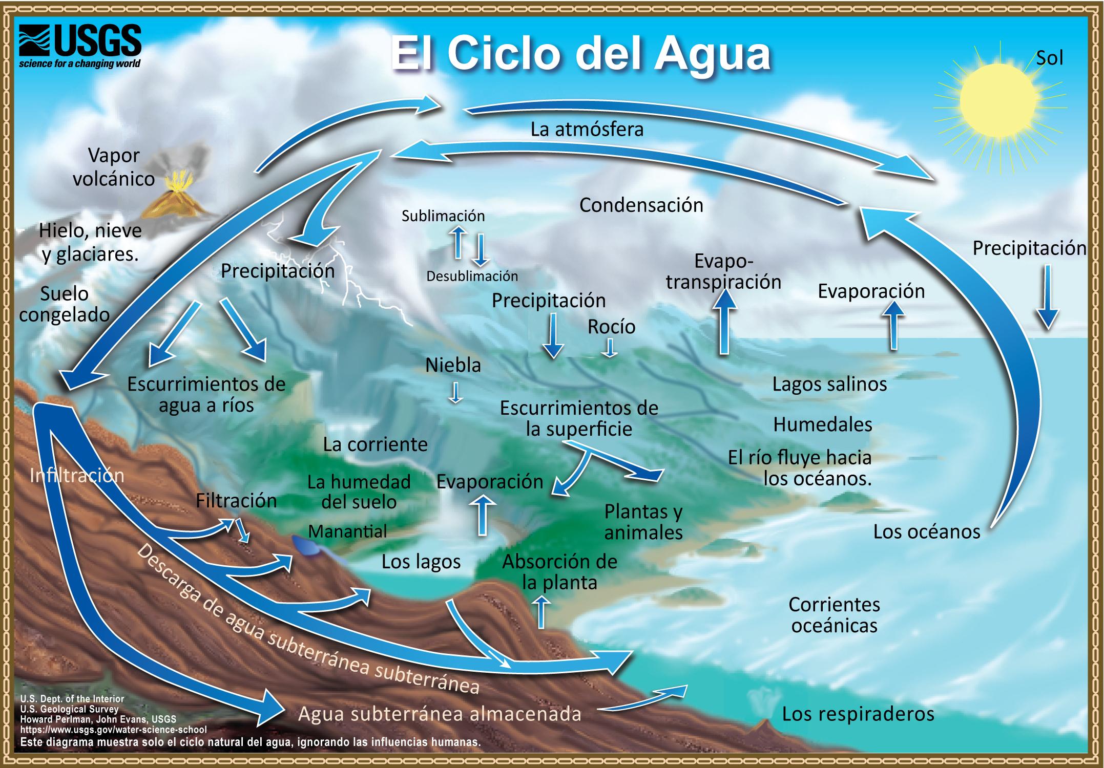 El contenido total de agua en nuestro planeta constituye lo que llamamos hidrosfera. Esto no solo incluye el agua líquida sobre la superficie terrestre en océanos, ríos y lagos, o la subterránea en pozos y acuíferos – también incluye al agua sólida en glaciares ó icebergs así como al agua en su fase gaseosa, en forma de vapor de agua, nubes y niebla. El agua abarca un 70% de la superficie terrestre, el cual está mayoritariamente distribuido en mares y océanos. Debido a que el agua se encuentra en la fase sólida, líquida y gaseosa, se presenta también en la geosfera, lo que conocemos como agua subterránea, y en la atmósfera. Nuestra hidrosfera posee una gran variedad de propiedades físicas y químicas que dotan a nuestro planeta de una característica especial y distintiva con respecto a los demás planetas y a cualquier otro astro: una de las más importantes, es que la vida no se podría originar sin la presencia de agua.2